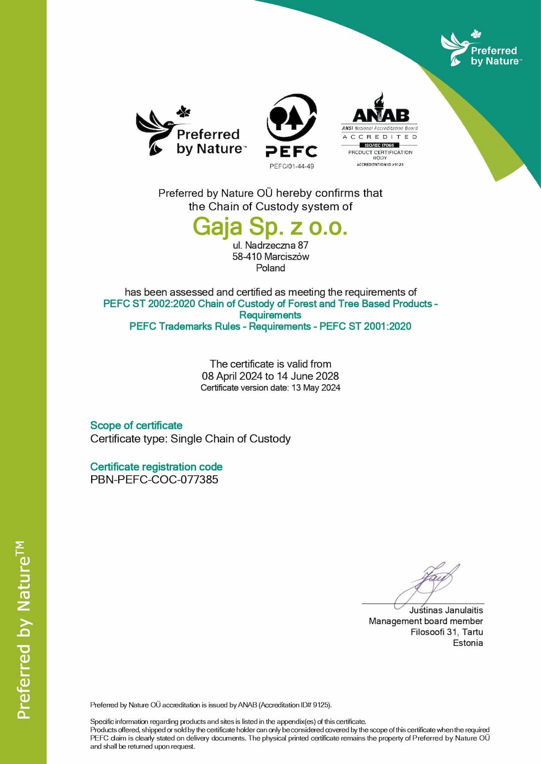 Gaja Sp. z o.o., located at ul. Nadrzeczna 87, 58-410 Marciszów, has received a certificate confirming compliance with PEFC ST 2002:2020 Chain of Custody of Forest and Tree Based Products and the PEFC Trademarks Rules - PEFC ST 2001:2020. The certificate was issued by Preferred by Nature OÜ and confirms that the company meets the requirements for the chain of custody of wood-based products. The certificate is valid from April 8, 2024, to June 14, 2028.